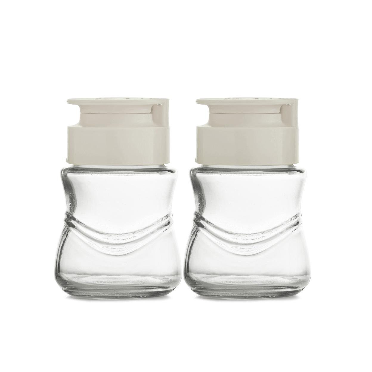 طراحی درب: درب فشاری با سوراخهای سوزنی شکل برای کنترل میزان ریختن نمک و فلفل.